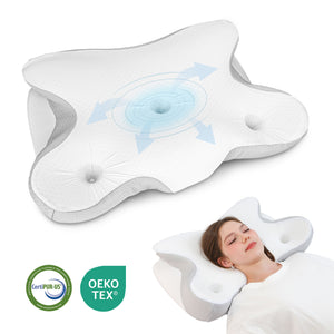 Featuring a unique hollow and butterfly-patented contour, Blinddarm ergonomic cervical neck pillow helps you promote proper alignment for a more restful night’s sleep. This memory foam pillow contours to your head and neck, naturally aligning your entire body spine and reducing cervical stress to the maximum. In addition, the neck pillow offers ample space for your shoulders without feeling cramped or constricted. Our neck support pillow is suitable for different sleeping positions: back, stomach and side sleeping. Finding the right height can help alleviate sleep issues such as headaches, snoring, and neck pain. Upgraded with more breathable and skin-friendly fabric, the sleeping pillow is CertiPUR-US certified and Oeko-Tex approved as well for quality and safety, ideal for both home and travel. Wake up refreshed anywhere with true pain-free support.