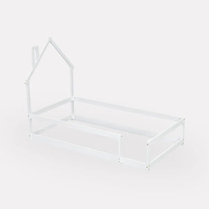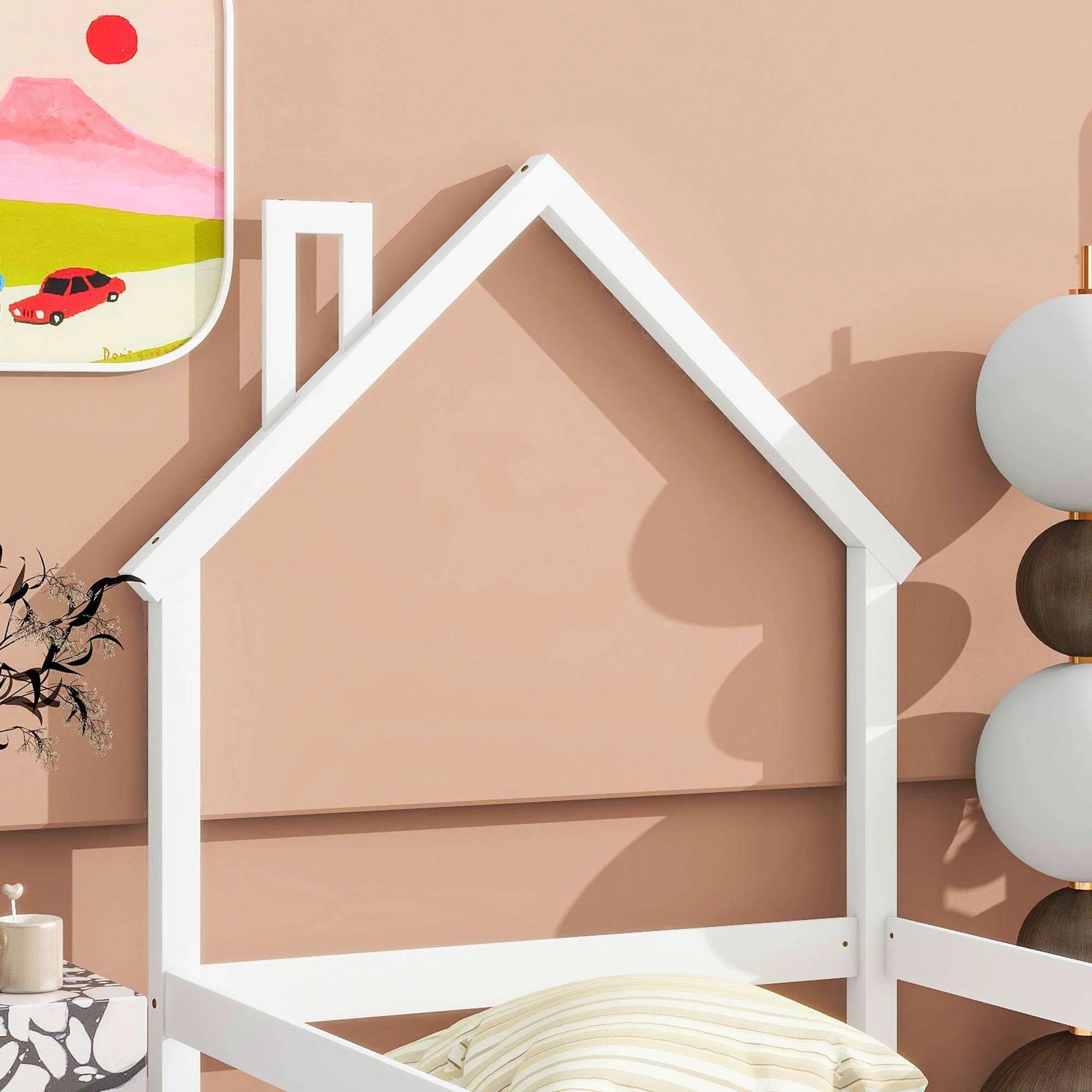 Blinddarm Twin Size Bed Frame Wood Bed with House-shaped Headboard, Floor Bed with Fences, White