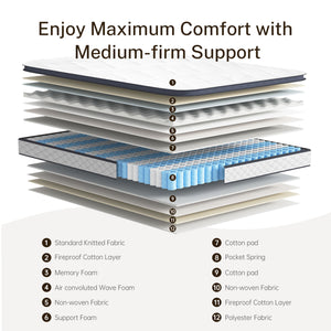 Optimal Comfort and Support: Discover Sleep Reinvented with Our Twin Size Hybrid Mattress: Dive into the epitome of bedroom innovation with our hybrid mattress, a masterful blend of individually wrapped coils and multiple foam layers, including plush memory foam. This combination offers a perfect equilibrium between robust support and heavenly softness, molding to your body’s every curve and promoting ideal spinal alignment. It efficiently mitigates pressure points and fosters profound, restorative sleep, allowing you to awaken invigorated and revitalized.