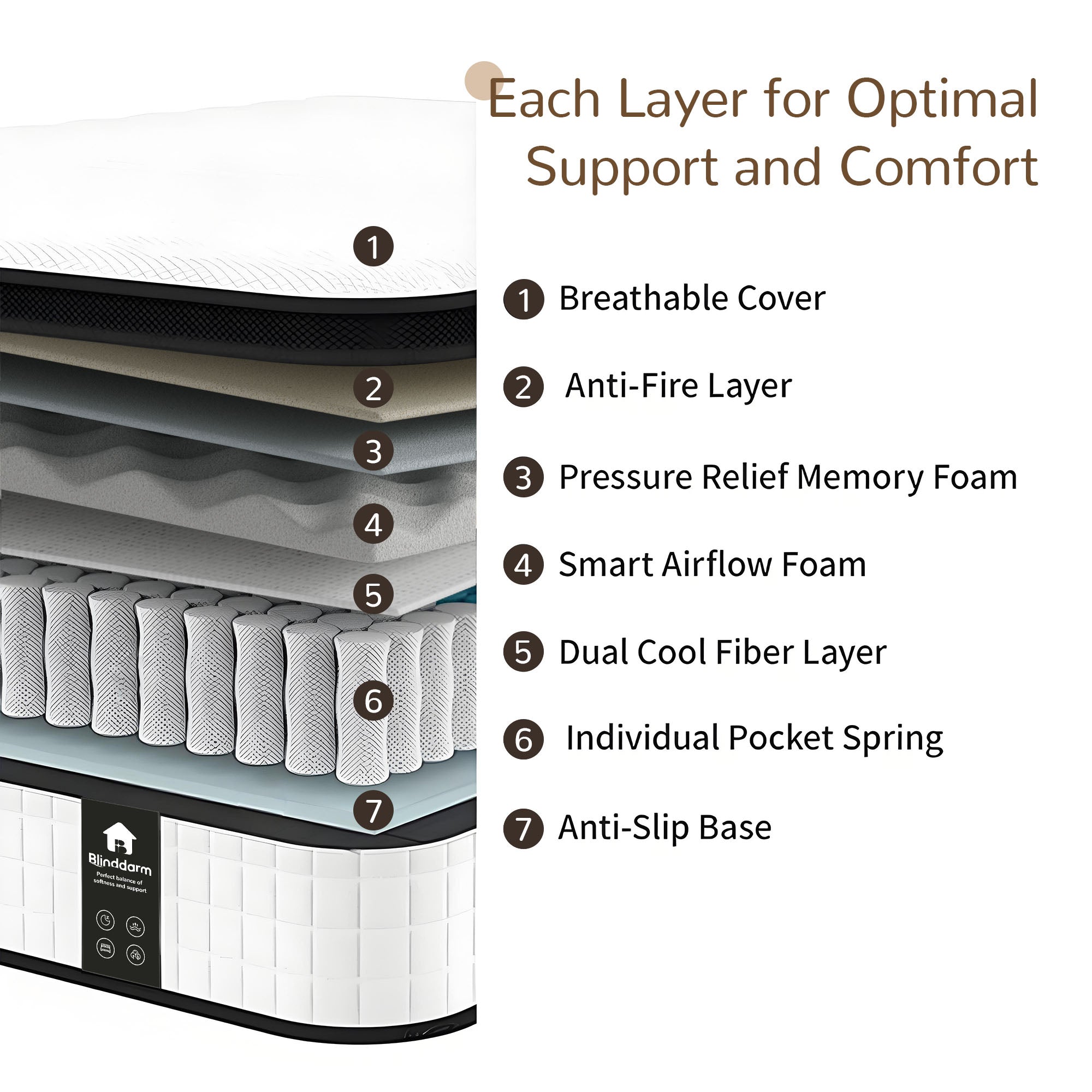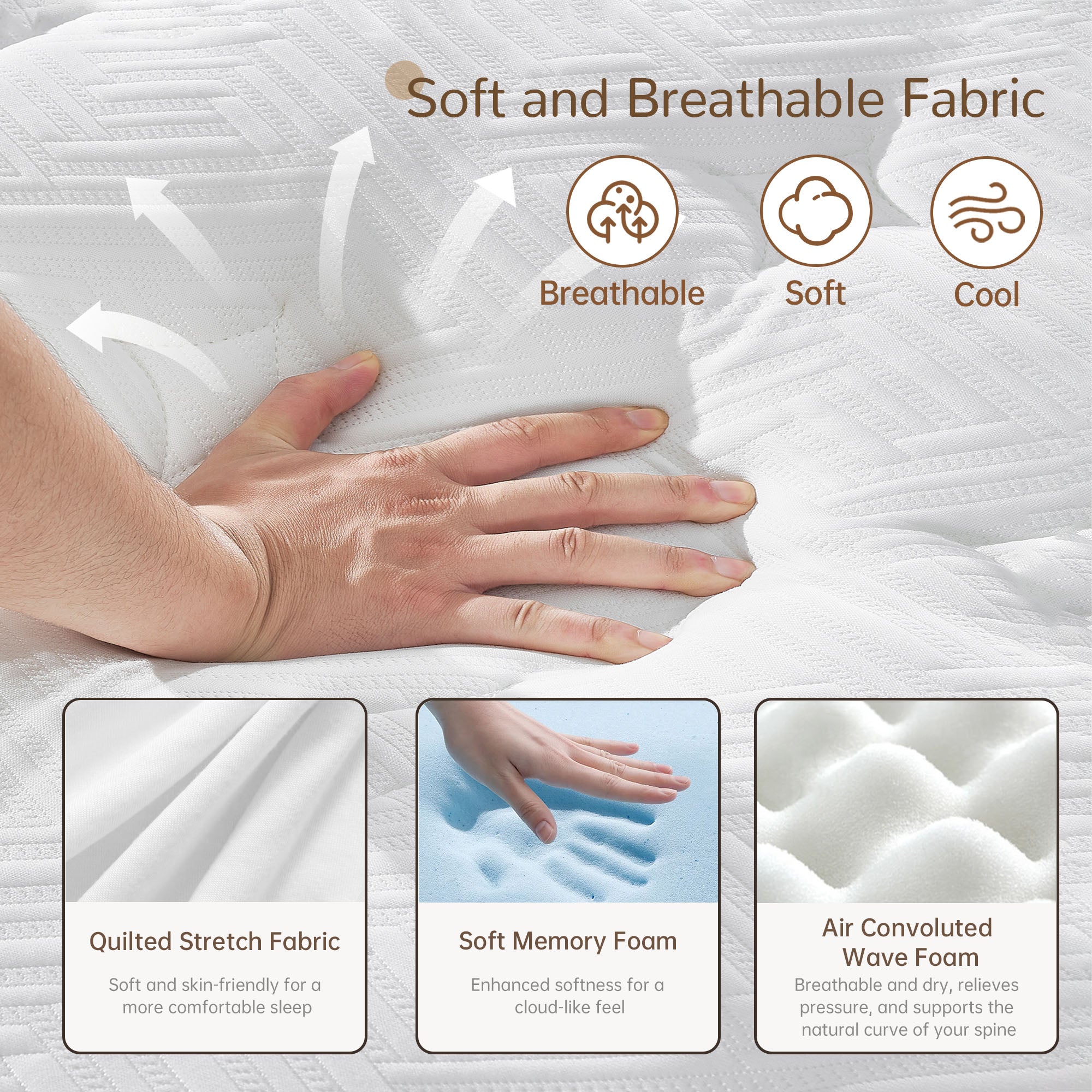 Our 12-inch hybrid mattress has individually wrapped pocket coils for even weight distribution and targeted support, preventing hip and lower-back sinking, better spinal alignment and back - pain relief. It has plush, responsive foam layers. Hundreds of pocket coils minimize motion transfer and reinforced edges prevent rolling off. The breathable knitted fabric, wave foam and pocket spring system keep you cool. It's CertiPUR - US and OEKO - TEX certified, made of premium materials, free of harmful chemicals. Delivered in a box, it's easy to set up on various frames and fully expands within 72 hours.