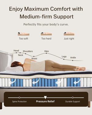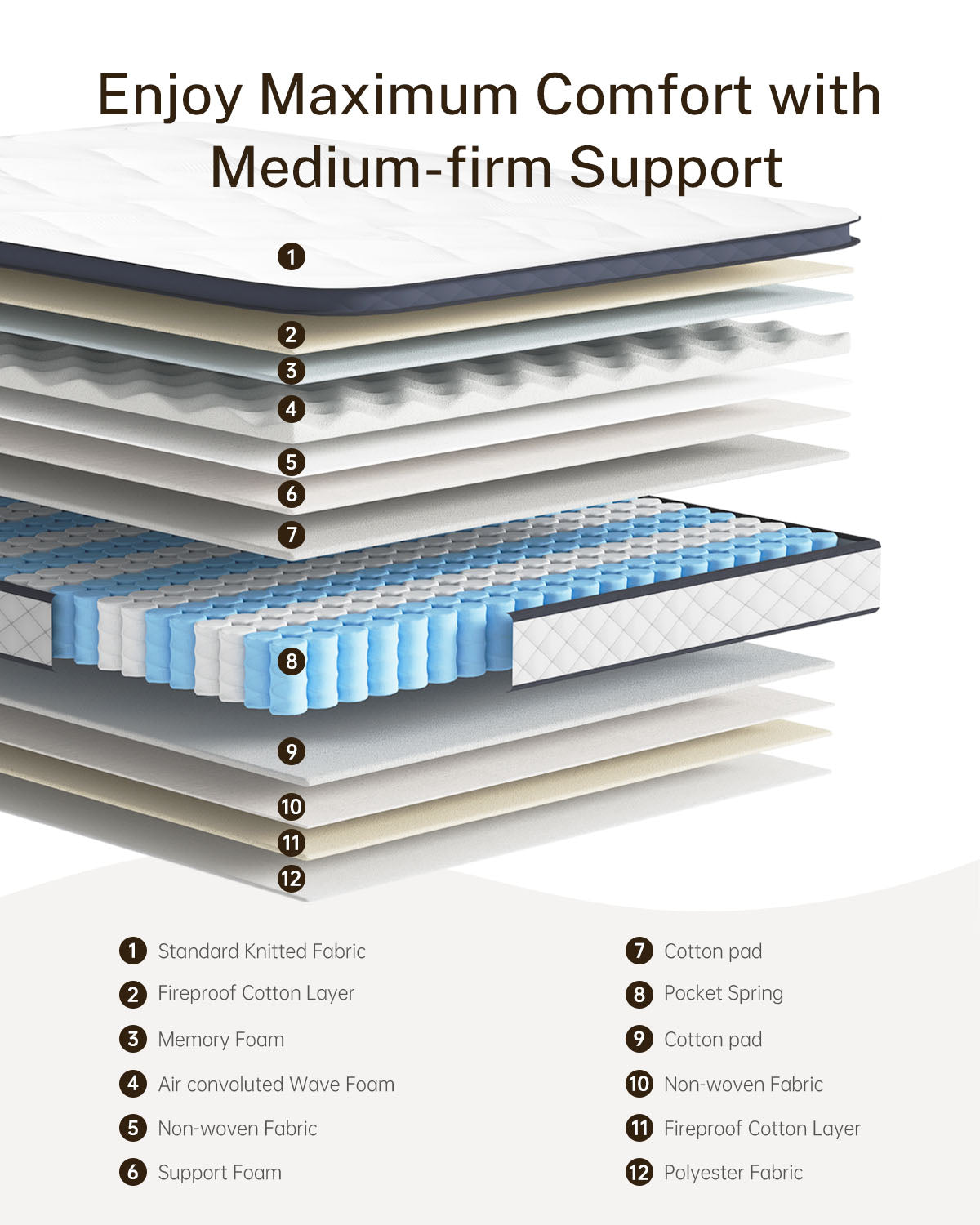 COMFORT & OPTIMAL SUPPORT FOR UNPARALLELED SLEEP: This mattress features an innovative blend of individually pocketed springs and premium memory foam, evenly distributing your weight from head to toe to relieve pressure points, eliminate body fatigue and aches, while offering superior pressure-relief support for every body contour.