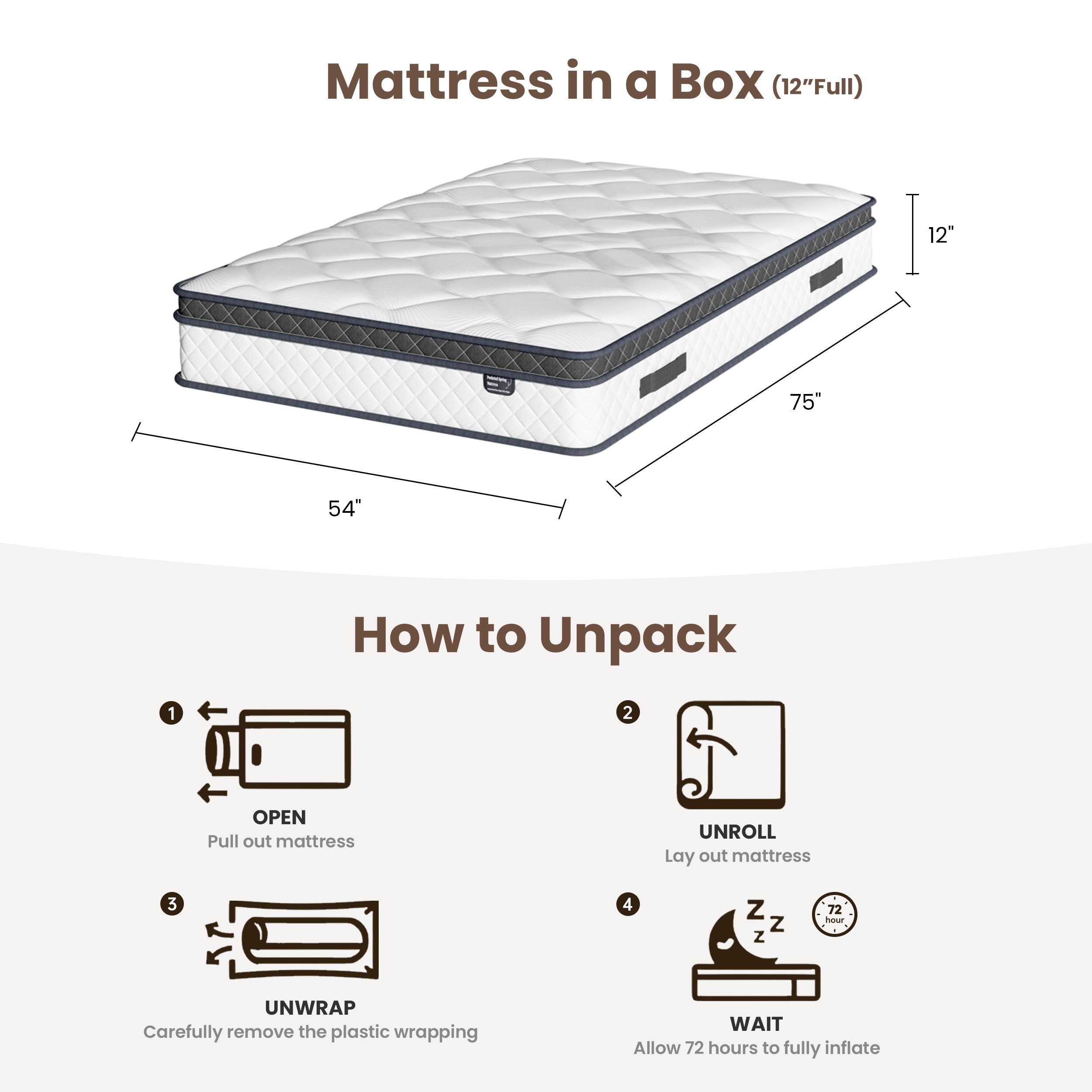 VERSATILE COMPATIBILITY & EFFORTLESS SETUP: Designed for seamless integration with 99% of bed frames—including traditional box springs, modern platforms, foundation, and even direct floor placement—this mattress eliminates the hassle of compatibility checks. The "roll-and-rise" technology ensures a 3-step setup: unroll, unwrap, and watch it expand to full 12-inch loft within 48-72 hours (no tools required!)
